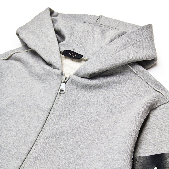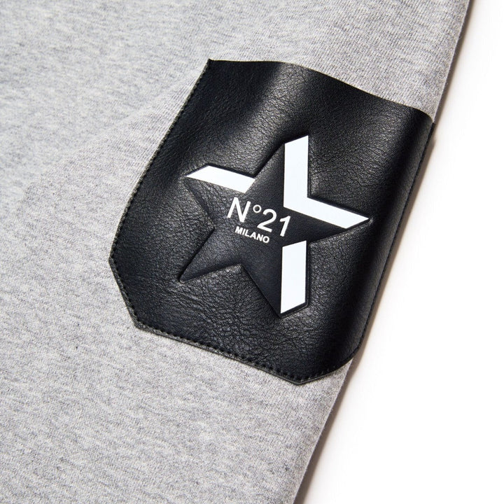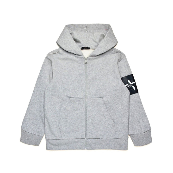 Long-sleeved melange full-zip hooded sweatshirt. Slightly oversized. Features an imitation leather pocket with star and N21 Milano logo on the sleeve. Pockets on the front. A versatile and easy-to-match casual option.
