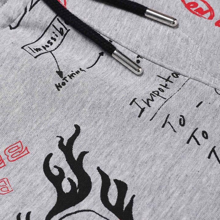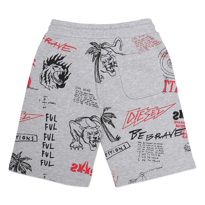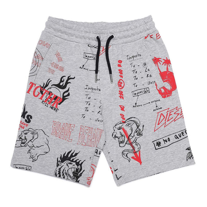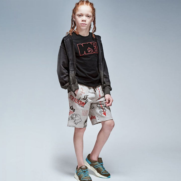 Boys grey jersey shorts by Diesel, made in soft and mid-weight cotton. They have a cool red and black sketched logo print and three useful pockets. The elasticated waist fastens with a drawstring.