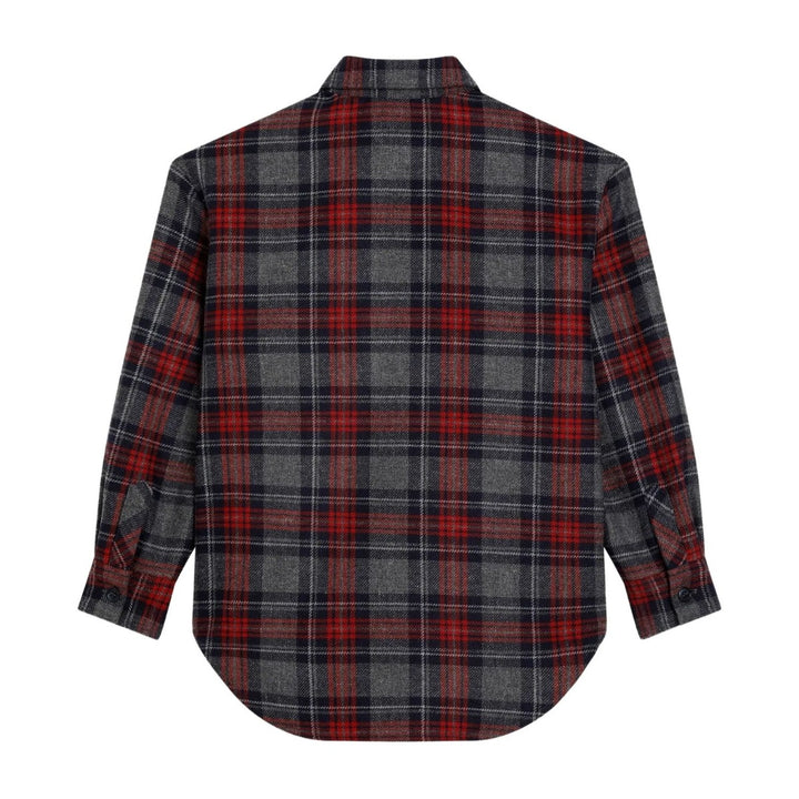 Dolce & Gabbana Kids medium grey & red plaid-check shirt featuring a button-up front, logo patch on the chest, curved hem, and long sleeves. Made in Italy from a soft poly-wool blend for a stylish layered look.