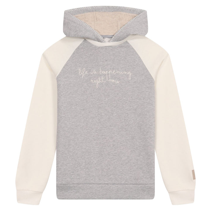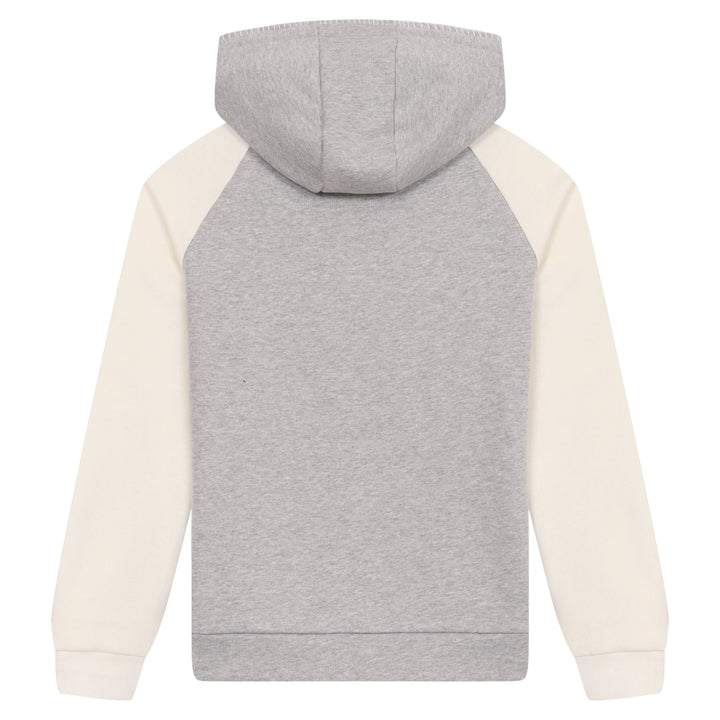 This boys hoodie features a modern color-blocked design in grey and white, crafted from soft, comfortable fabric for all-day wear. It is detailed with an embroidered logo on the front, adding a signature touch of style and brand identity. Complete wi
