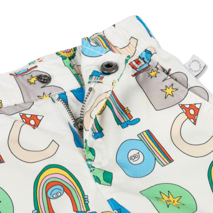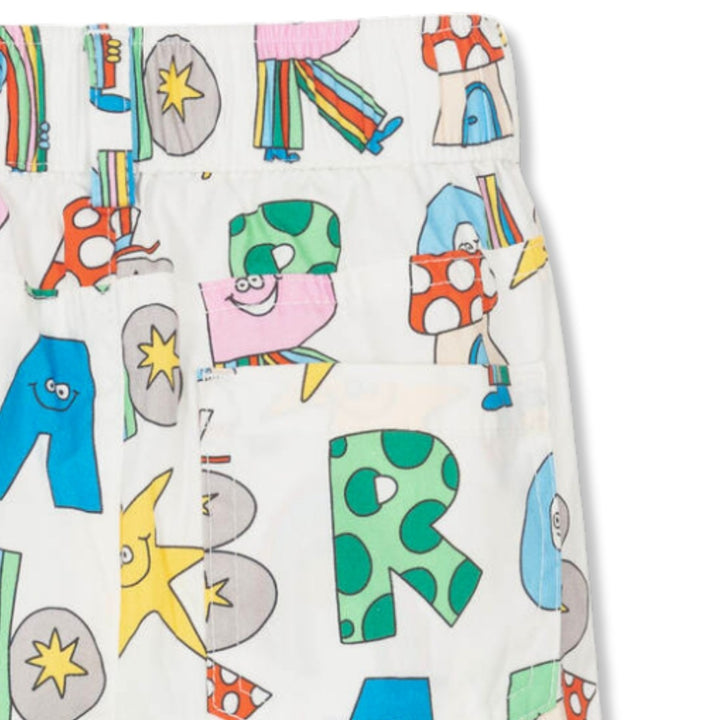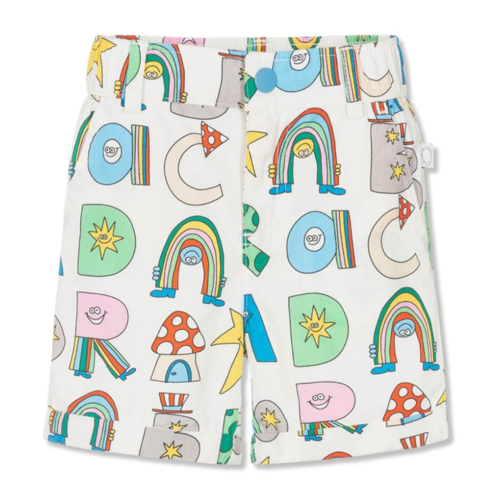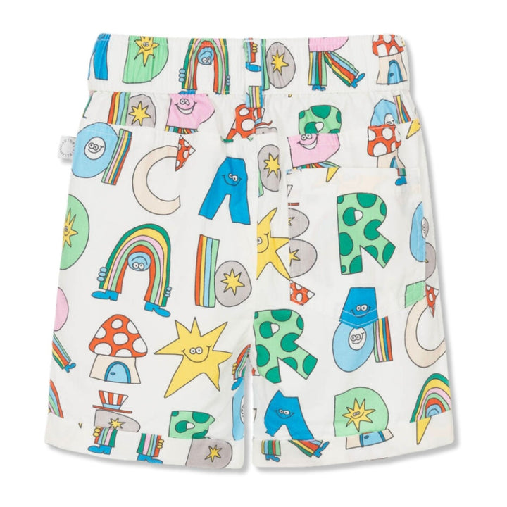 An ivory cotton pair of shorts by Stella McCartney Kids for younger boys, with a colourful magic letters print. Made in soft organic cotton poplin for a more sustainable choice, they have a comfortable stretchy waistband with a single popper fastening and numerous little pockets for a more grown-up look.