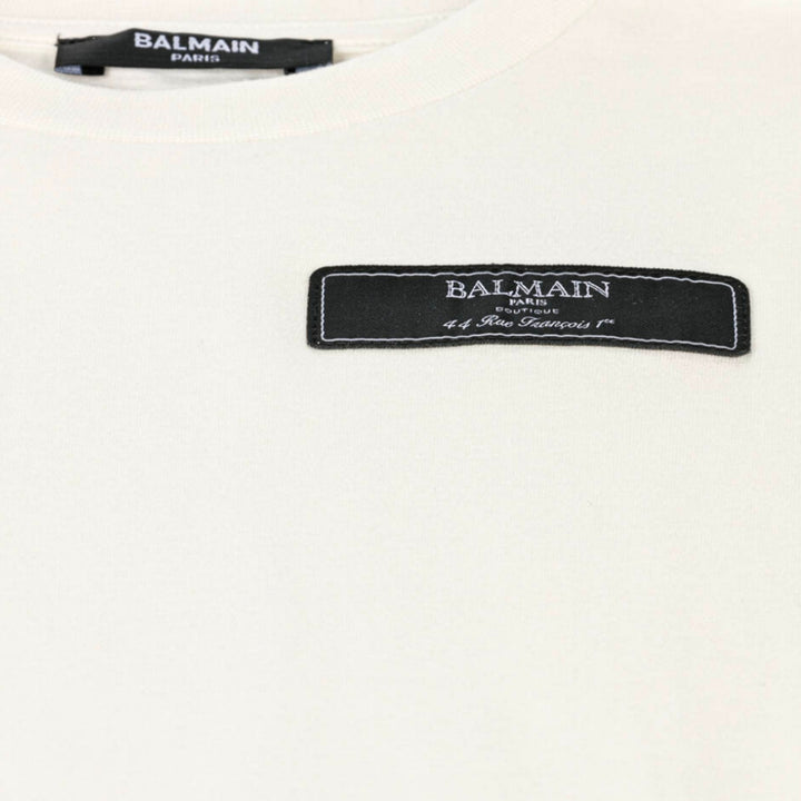 Ivory T-shirt for boys by luxury French label Balmain, made in soft cotton jersey. Ideal for everyday casual wear, it is styled with a crew neckline and short sleeves. A black logo patch on the chest adds a designer finishing touch.
