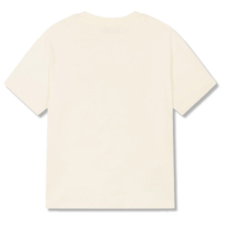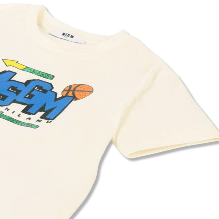Ivory T-shirt for boys from Italian designer MSGM, in a relaxed fit with dropped shoulders and short sleeves. A cool, varsity-style logo graphic is printed on the front, complete with an orange basketball and red sneaker, adding to the sporty feel. T