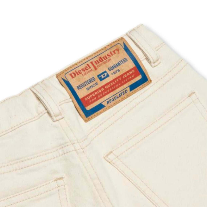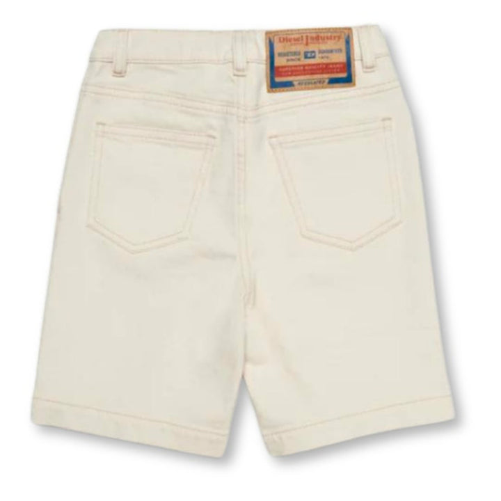Shorts in ivory stretch denim. Ideal for a casual streetwear style. The garment is part of the Diesel Library pack of iconic and timeless pieces. What are the three characteristics responsible for Diesel Library. The fabrics used are made from low-im