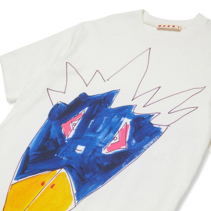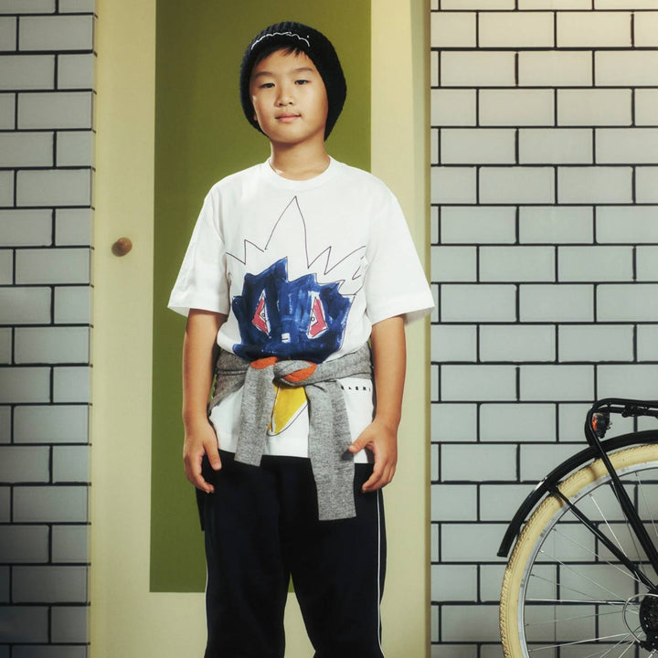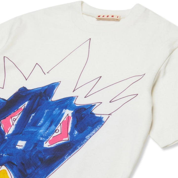 Add a cool, contemporary touch to your childs wardrobe with this new-season Marni Kids T-shirt. Crafted from soft 1% cotton in light grey, it features a bold logo and graphic print at the front. The classic round neck and short sleeves make it a comf