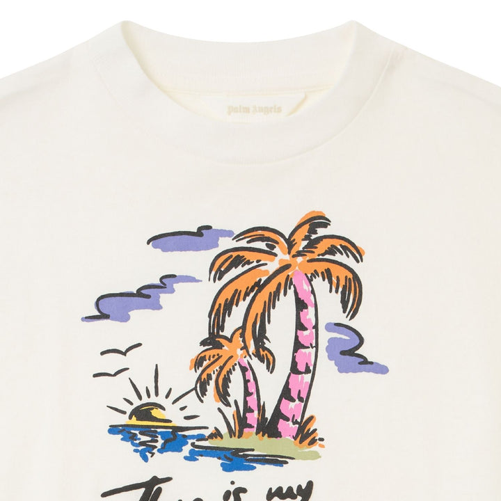This ivory T-shirt by Palm Angels brings a playful yet modern edge to casualwear. Made from soft cotton, it features a bold graphic print across the front, capturing the brands distinctive street-inspired aesthetic.