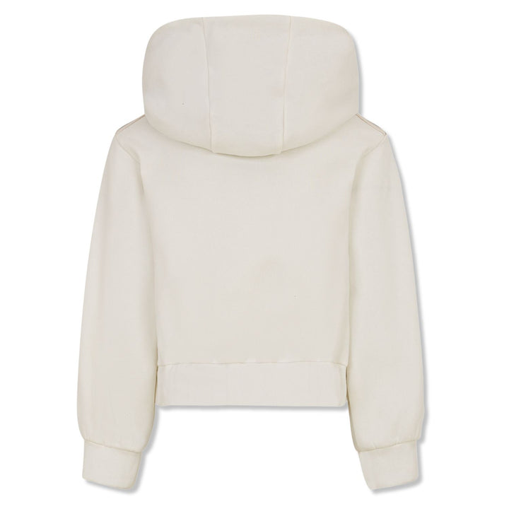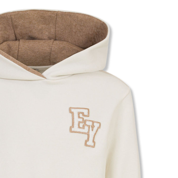 This boys ivory hoodie features a classic pullover design crafted from soft, high-quality fabric for maximum comfort. It is accented with a tonal logo patch at the front, adding a minimalist yet stylish brand touch. The hoodie includes a spacious kan