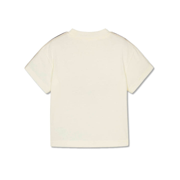 Ivory cotton T-shirt for boys by Palm Angels, trimmed with signature beige and black tape. Casual and comfortable, it is made in soft jersey with the designer's instantly recognisable logo printed in black on the chest.