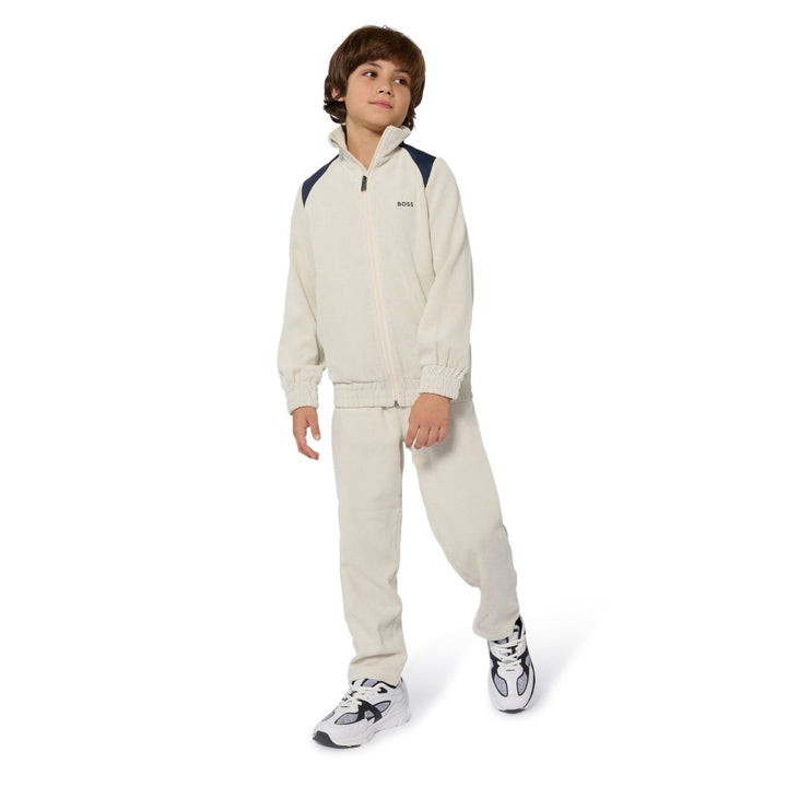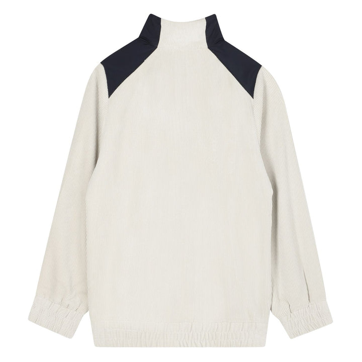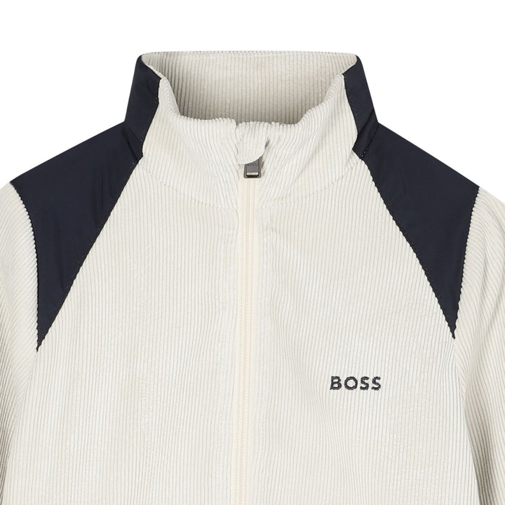 This stylish zip-up jacket from BOSS features a crisp ivory color with contrast black panels on the shoulders for a modern, sporty look. Designed with a high neck, full front zipper, and elasticated cuffs and hem, it offers a comfortable and customiz