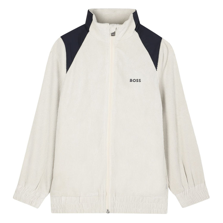 This stylish zip-up jacket from BOSS features a crisp ivory color with contrast black panels on the shoulders for a modern, sporty look. Designed with a high neck, full front zipper, and elasticated cuffs and hem, it offers a comfortable and customizable fit. The subtle BOSS logo on the chest adds signature branding, while the soft, textured fabric ensures lightweight warmth for layering during cooler days. Perfect for casual or athletic wear.