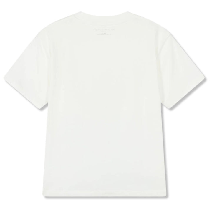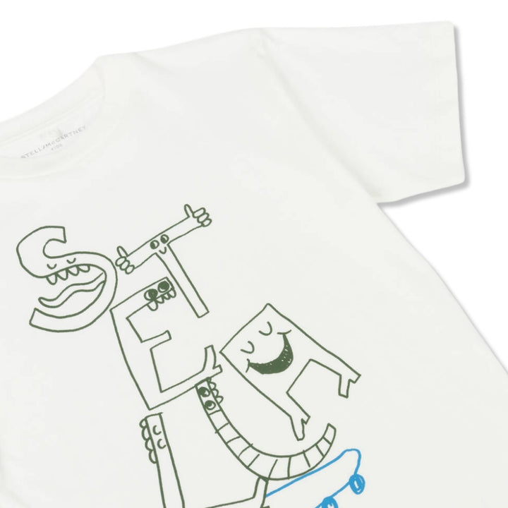 Ivory cotton T-shirt for boys by Stella McCartney Kids, made in soft jersey. In a comfortable oversize fit, it features fun and happy skateboarding logo letters in green and blue.