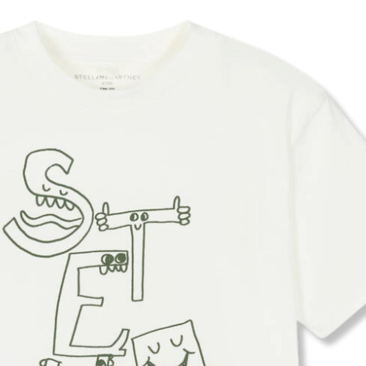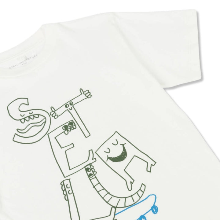 Ivory cotton T-shirt for boys by Stella McCartney Kids, made in soft jersey. In a comfortable oversize fit, it features fun and happy skateboarding logo letters in green and blue.