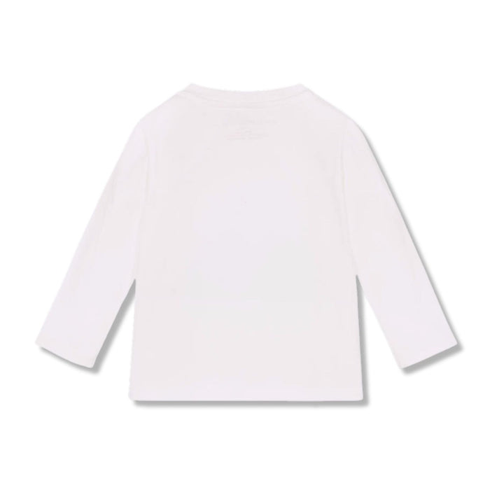 Ivory T-shirt for baby boys by Stella McCartney Kids, made in organic cotton jersey for comfortable wear. This long-sleeved style has a blue tractor print on the front with bright green wheels. The sustainable designer's name is incorporated within the farm-themed design. The neckline is lightly ribbed and the popper fastenings on one shoulder help with dressing. The Stella McCartney fit can be quite small so choose a size up if you want room to grow.