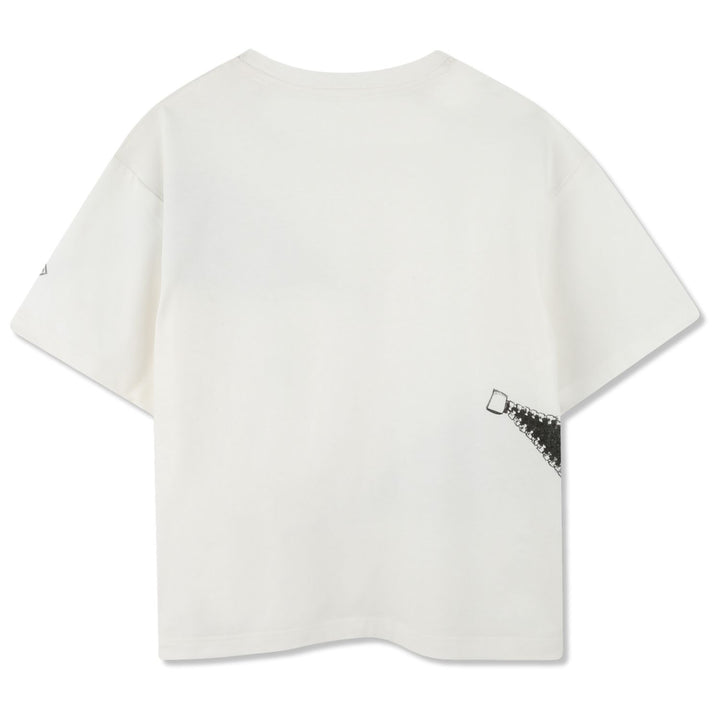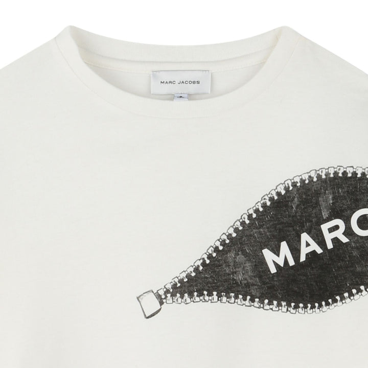 Marc Jacobs Boys Ivory Zipped Logo-Print T-Shirt features a sleek zip detail and a stylish logo print. Crafted for comfort and effortless style, it is perfect for casual wear.