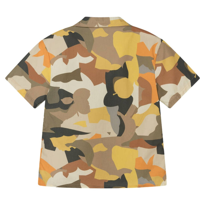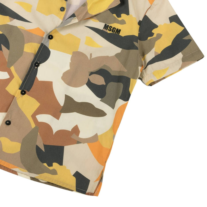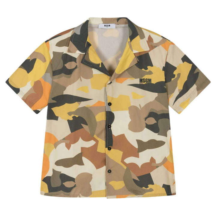 Boys Khaki Green shirt by MSGM, styled with a cool revere collar and a relaxed fit. Patterned with a colourful camouflage print inspired by the label's 'Safari' theme, it has a bold black logo print on the front and branded buttons to fasten.