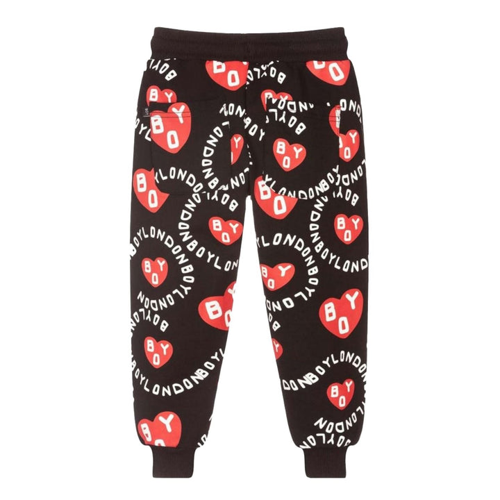 Black joggers for boys and girls by BOY London, made in soft cotton sweatshirt jersey with a fleecy inside. They are printed with a red heart and white logo pattern. They have an adjustable drawstring waistband and side and back pockets. There are ri