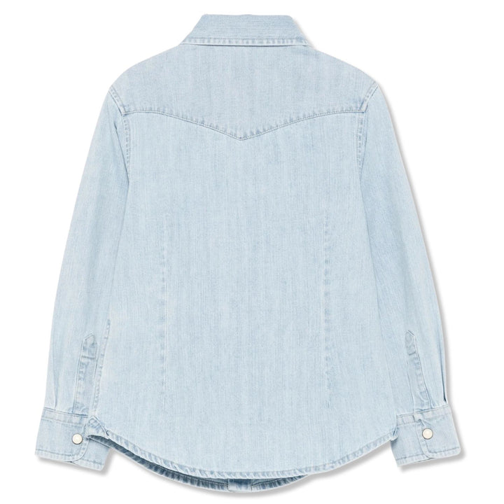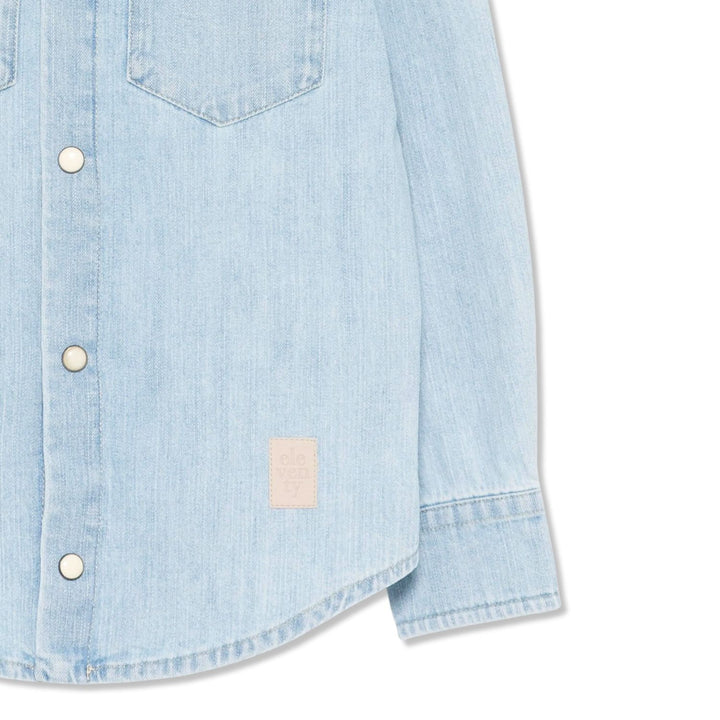 This light blue denim shirt combines classic western style with modern details. Featuring a pointed collar, snap button front closure, and two chest flap pockets with snap closures, it offers both versatility and comfort. The shirt is finished with a subtle brand patch at the hem and a softly curved hemline at the front and back, making it ideal for layering or wearing on its own for a casual, timeless look.
