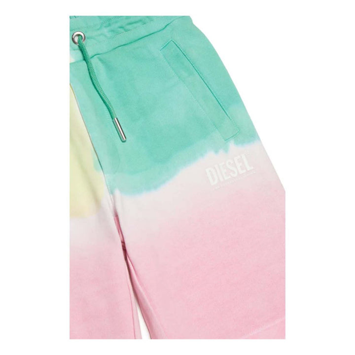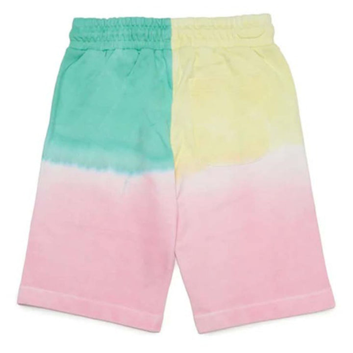 Multicoloured fleece shorts with drawstring waist, featuring pastel colours and a summer mood. They feature a contrasting logo on the leg.