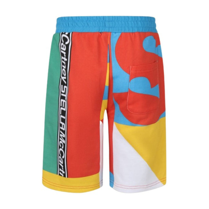 A boys pair of multicoloured shorts from the brand Stella McCartney. These jogger-style shorts feature an elasticated waist for comfort and has a pocket on both sides as well as featuring a geometric brand logo print all over.