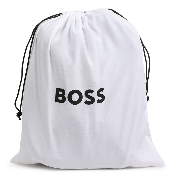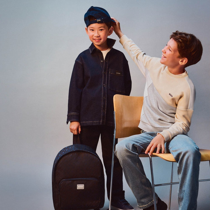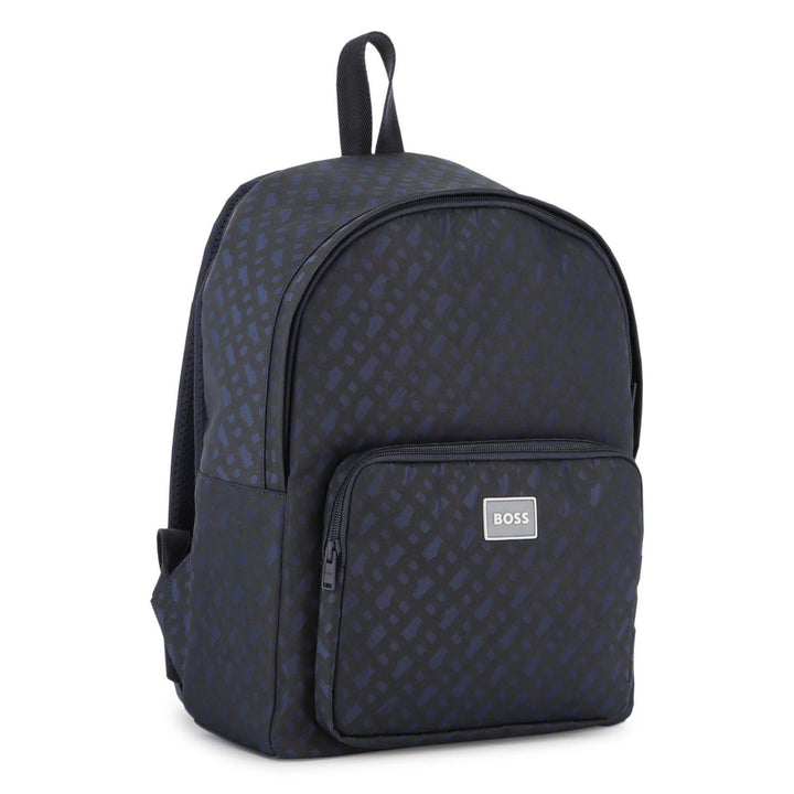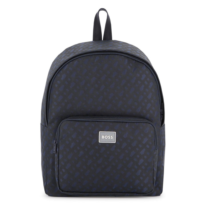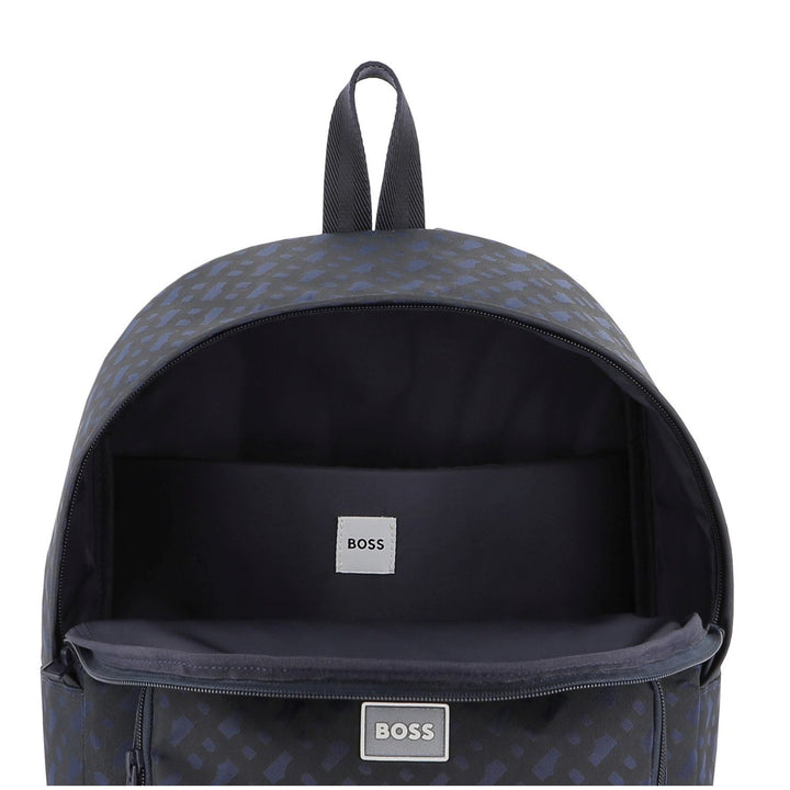 This stylish navy blue backpack from BOSS is crafted with a subtle monogram pattern and features a signature BOSS logo patch on the front zip pocket. The backpack includes a spacious main compartment, a front zipper pocket for small essentials, and a comfortable top handle and adjustable straps. Made from durable material, it is ideal for school, travel, or everyday use, combining practicality with modern branded flair.