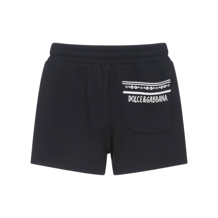 Navy blue shorts for boys by luxury Italian brand Dolce & Gabbana, made in soft, mid-weight cotton jersey. Casual and comfortable, they have slanted front pockets and a patch pocket on the back with a rubberised white logo. There is a white DG logo o