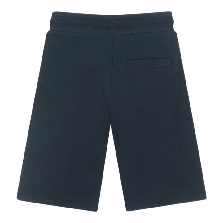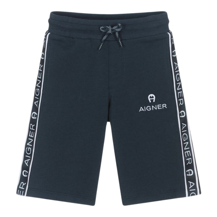 Navy blue cotton shorts for boys by AIGNER, with branded taped trims. Made in soft jersey, these casual shorts have white logo embroidery on the front, featuring the signature 'A' horseshoe. They have useful pockets concealed in the side seams and a