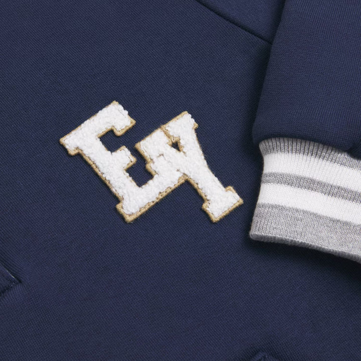 Navy blue long-sleeved top for boys by Italian label Eleventy Milano, made in soft mid-weight cotton jersey. The casual sweatshirt design has polo styling, with a contrasting ribbed collar and trims in beige and white stripes. A concealed button placket at the neck and a pouch pocket on the front complete this hybrid top. Ideal for layering on cooler days, it has a letterman-style applique logo on the chest for a varsity-inspired finish.