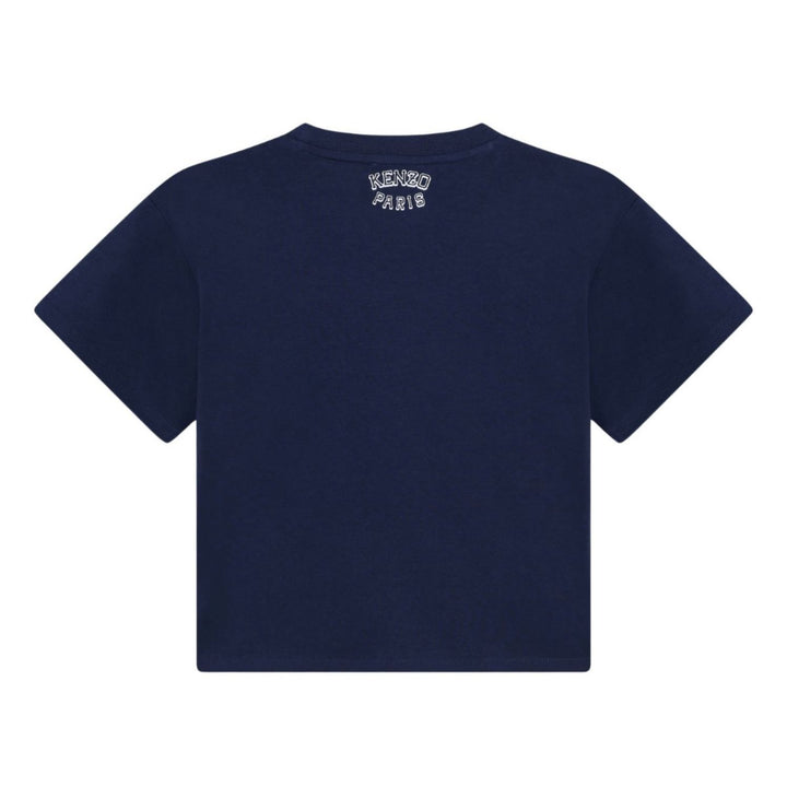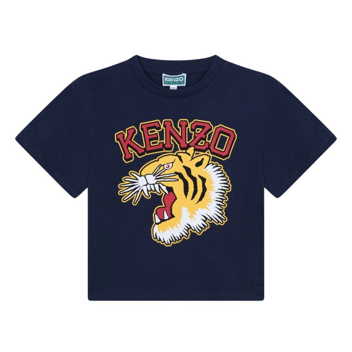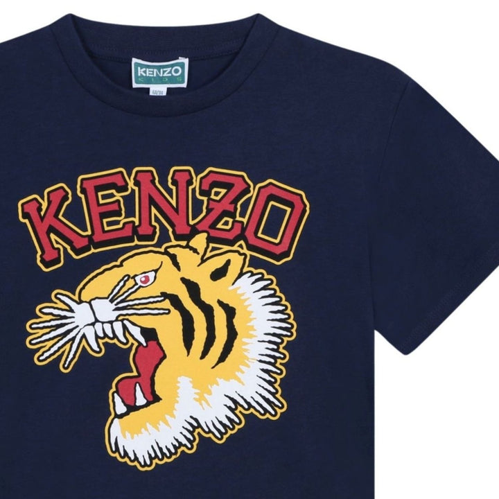 Navy blue T-shirt for little boys by KENZO KIDS, made in soft and stretchy organic cotton jersey. Cool and comfortable, the brand's Varsity Tiger is printed on the front in vibrant yellow with a red and yellow logo above and a small white logo on the