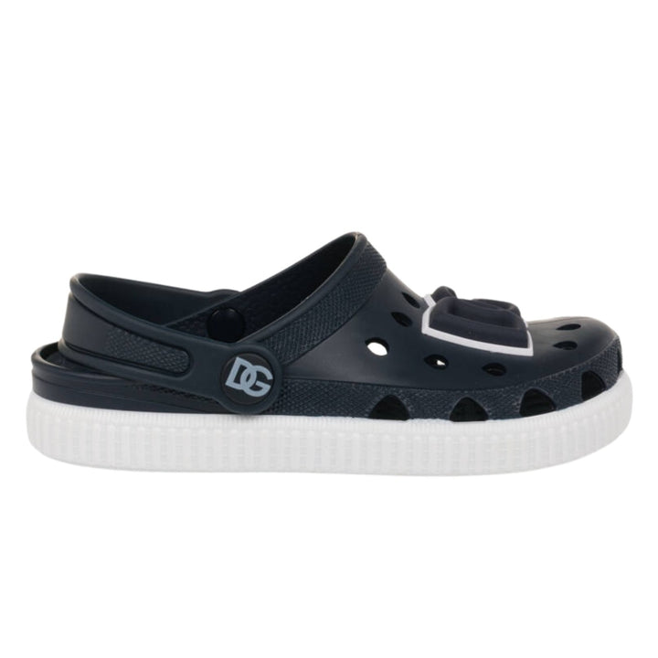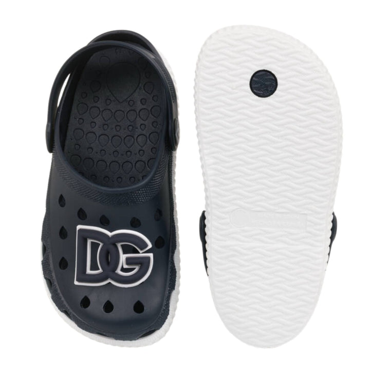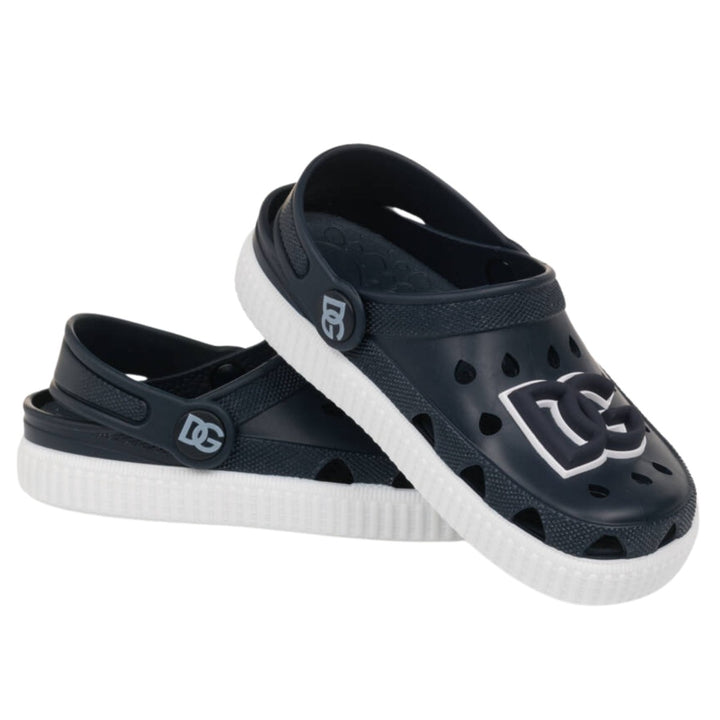 Lightweight navy blue clog sandals for boys by luxury fashion house Dolce & Gabbana. Made in smooth PVC with holes for breathability and quick drying, they are ideal for wearing in and around water. The brands iconic DG logo is displayed on the front and on the rotating ankle strap for added designer appeal.