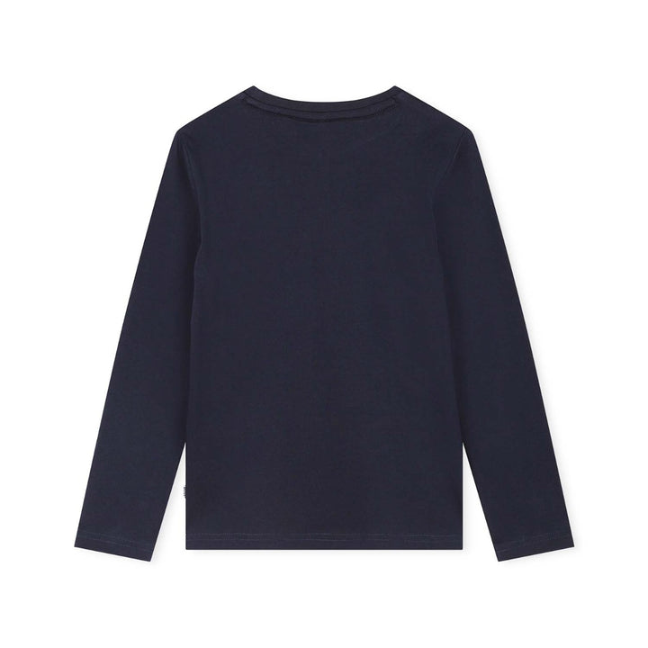 Navy blue t-shirt for boys from BOSS, made from cotton and designed in a slim-fitting style. The soft jersey fabric provides comfort and the blue futuristic graphic on the chest adds brand appeal. This long-sleeved top has a logo tab on the side to complete the look.