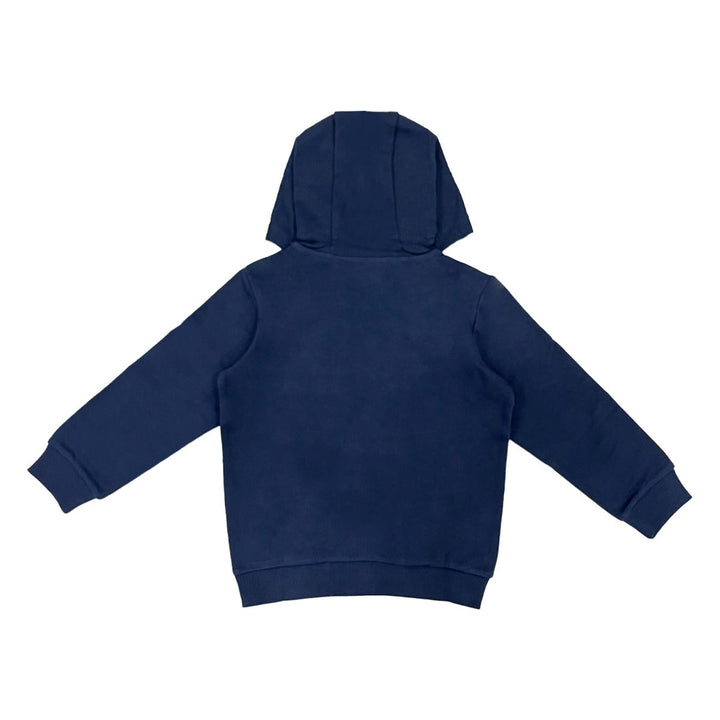 Navy blue marl cotton hoodie for boys by luxury French fashion house Balmain. Made in soft, mid-weight jersey for comfortable wear, this casual top has ribbed trims and a useful pouch pocket on the front. A black logo label is stitched on the chest,