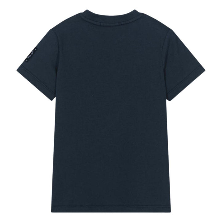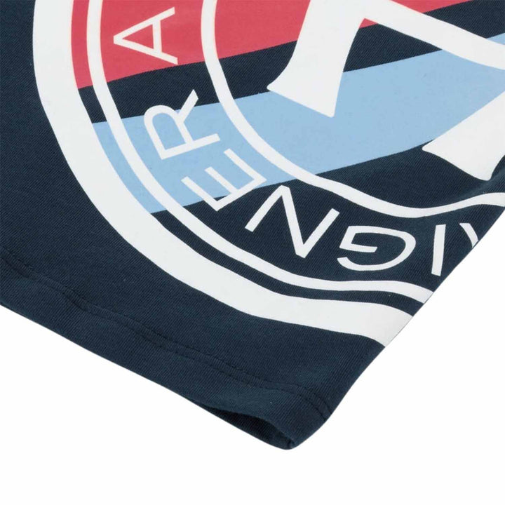 Boys navy blue T-shirt by AIGNER, made in soft cotton jersey for comfortable wear. For a distinctive designer look, there is a circular 'A' horseshoe logo design on the front in white, with red and blue stripes.