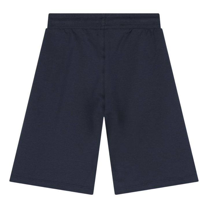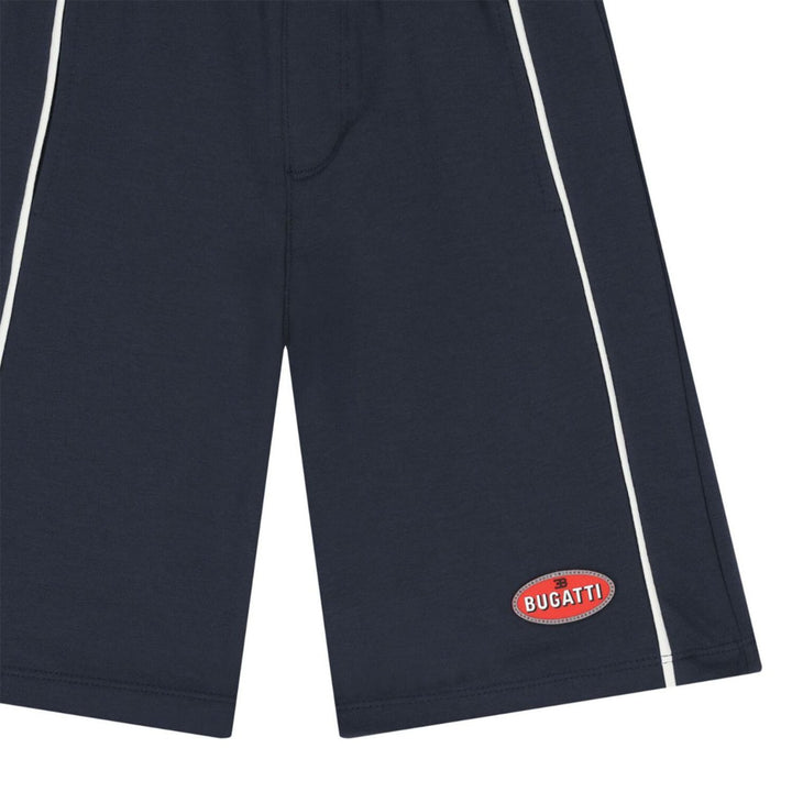 Navy blue shorts for boys by Bugatti Junior. Made from soft cotton, they feature the brands logo rubber badge in red on one leg. They have front pockets and white piping. Finished with an elasticated waistband and drawstring for comfortable fit.