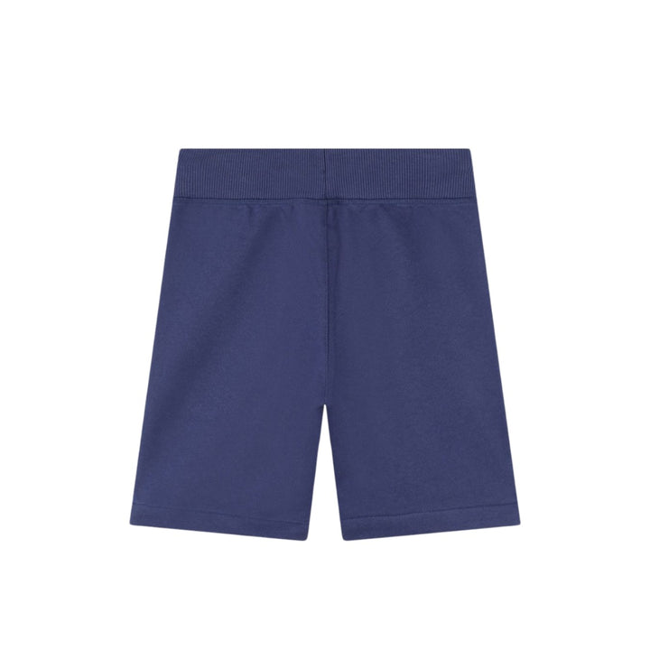 Navy blue shorts for boys by HUGO. Made from a mid-weight soft cotton jersey, they feature the brands logo print in red on the front of one leg. They have concealed side pockets and fasten with an elasticated waistband and drawstring for a comfortabl