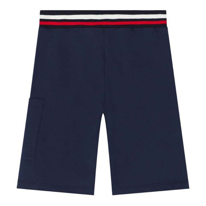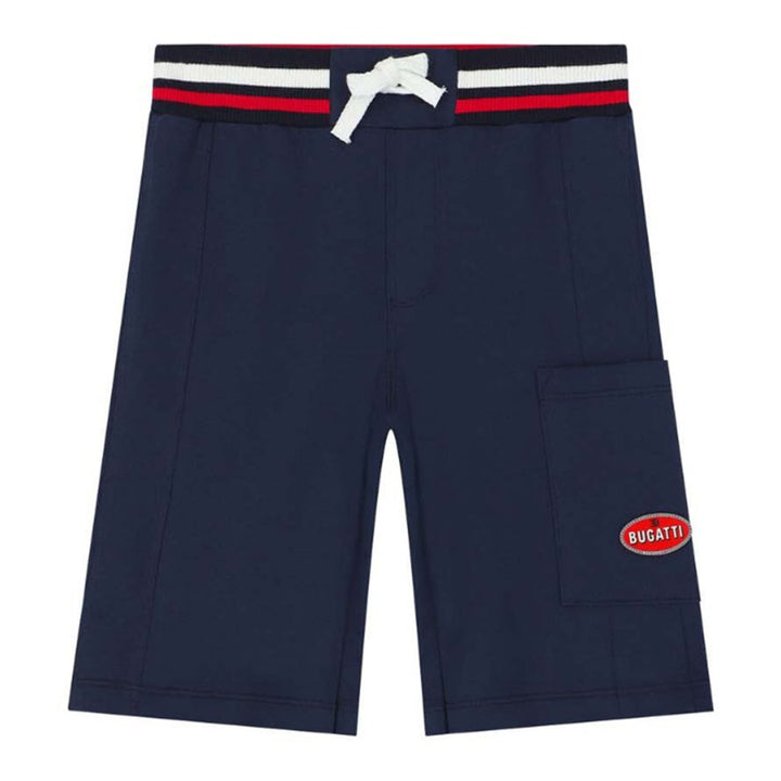 Navy blue shorts by Bugatti Junior. Made from soft cotton jersey, it features the brands iconic rubber logo badge on the pocket. Finished with an red, navy and white striped elasticated waistband and white drawstring for comfortable fit.