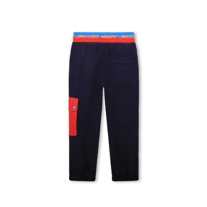 Blue sports trousers in teddy fabric, elastic waistband with drawstring, side and back pockets and pocket with flap and press studs on one leg. It is embellished with logo at the waist.