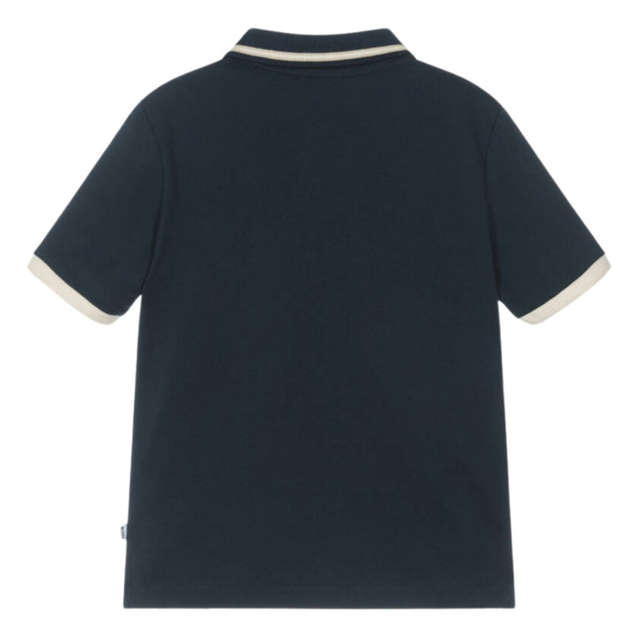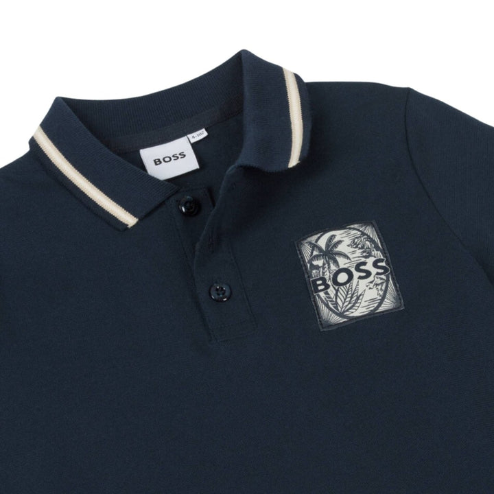 Navy blue polo shirt for boys by BOSS, made in comfortable cotton pique. The standout logo patch adds a stylish touch, while the buttoned placket and contrast trims offer a refined look.