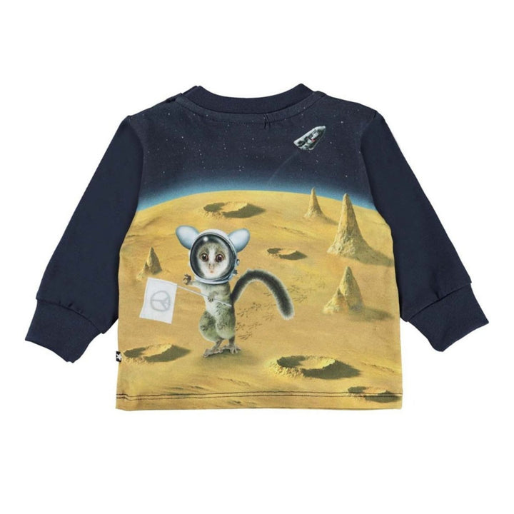Easy-wearing navy blue T-Shirt for little boys by Molo, made in mid-weight organic cotton jersey. Fastening with poppers on one shoulder, it has an planet surface print on the front with cute animal astronauts.