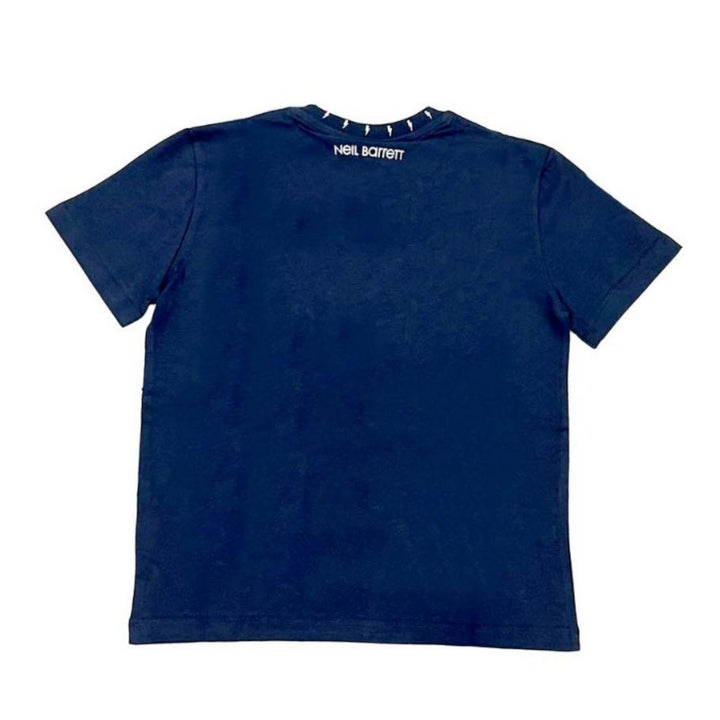 Boys Navy Blue T-Shirt By Neil Barrett. Made From Soft Cotton, It Features A Signature Thunderbolt In Black Colour On The Round Collar With A Side Pocket And It Has A Logo Print At The Back Neck.