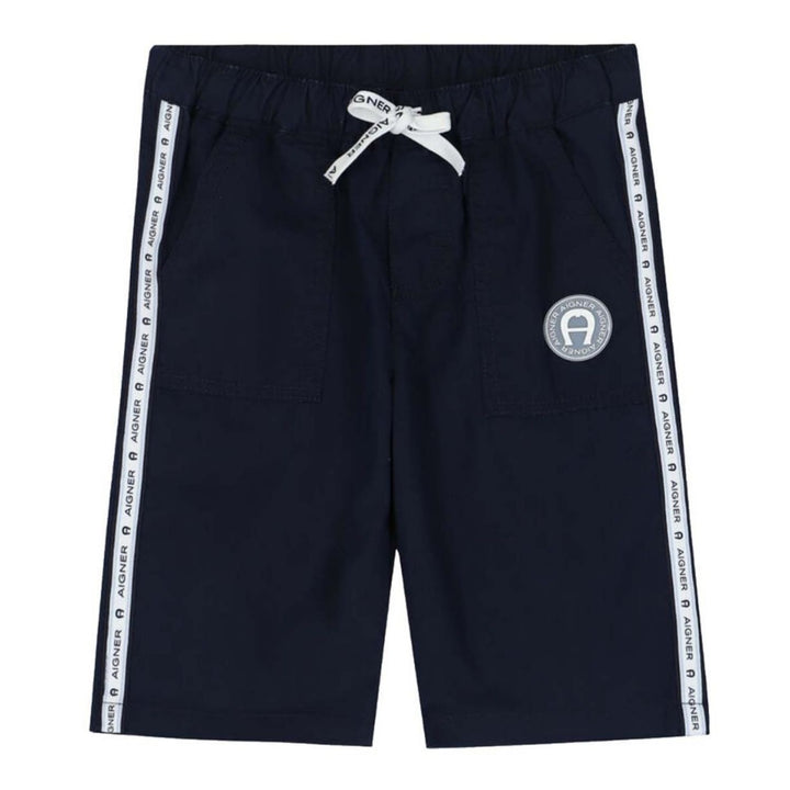 Navy logo shorts for boys by Aigner. Made from soft cotton, it features the brands iconic horseshoe logo rubber badge on the front and logo tape on the side. They have classic four pocket styling and an elasticated waist and drawstring for comfortabl