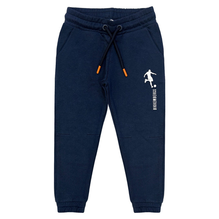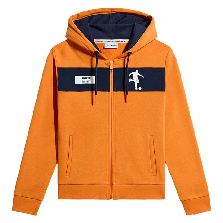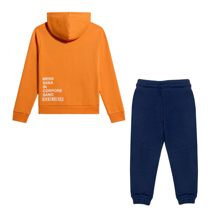 This sporty and comfortable full-length tracksuit features a vibrant orange zip-up hoodie with bold navy detailing and a footballer graphic, paired with matching navy joggers. Designed for active kids, its perfect for play, travel, or casual days out