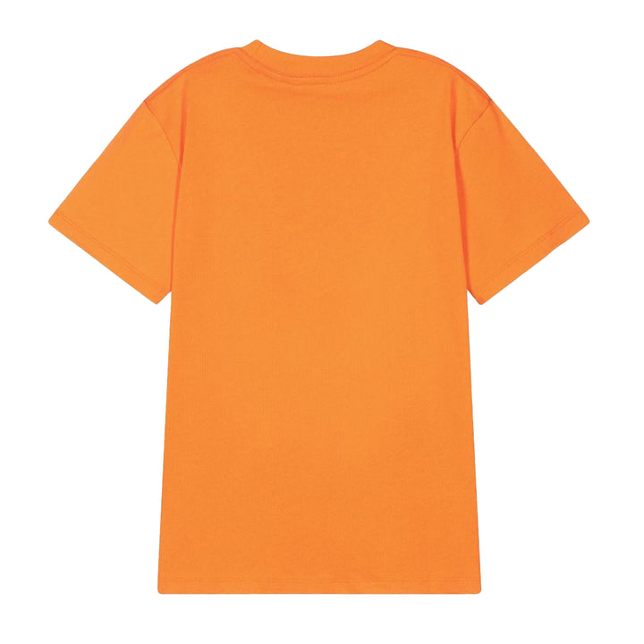 Orange graphic T-shirt for teen boys by Molo, made in soft organic cotton jersey. Printed on the front is a black, grey and orange futuristic sports car flying above the mountains, it also has a logo tab on the side seam.