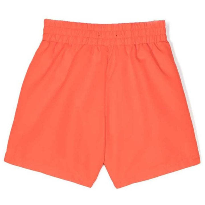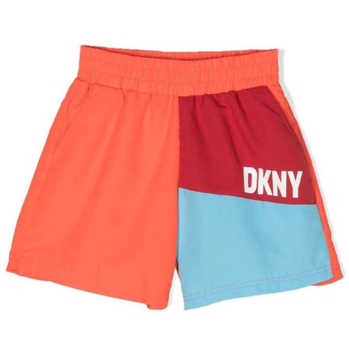 Orange swim shorts for boys by American brand DKNY, with contrasting red and blue panels. Silky and lightweight, they have a white logo print on the front, with an elasticated waistband, jetted pockets and a mesh lining for comfort.