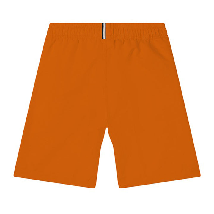 Silky smooth bright orange swim shorts for boys, unmistakably by BOSS. They have a large white logo on one leg and a signature, striped tab on the back of the comfortable elasticated waistband. The faux drawstring has branded end caps to complete the