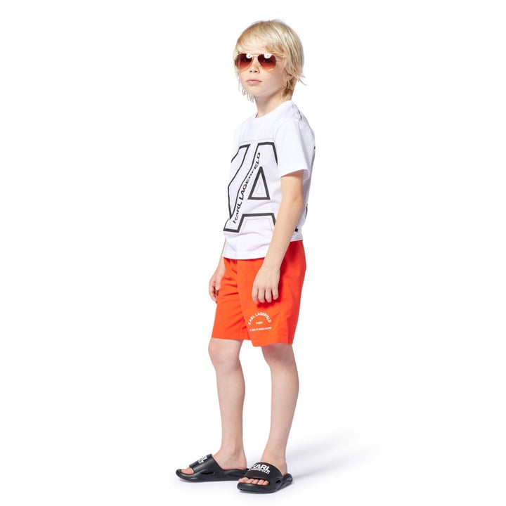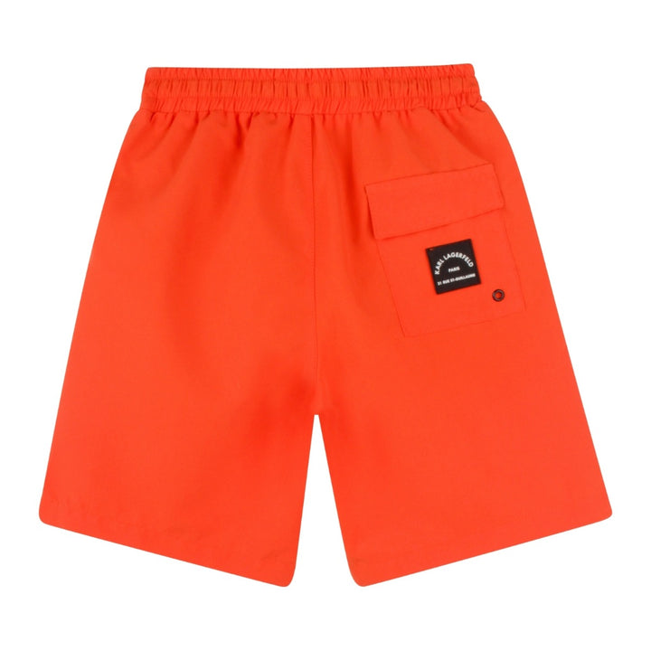 Orange Mini-me swim shorts for boys by KARL LAGERFELD KIDS, made in soft and lightweight fabric. These easy drawstring shorts have a Rue St Guillaume print on the leg and a black logo patch on the back pocket. The shorts are lined with mesh for added comfort.