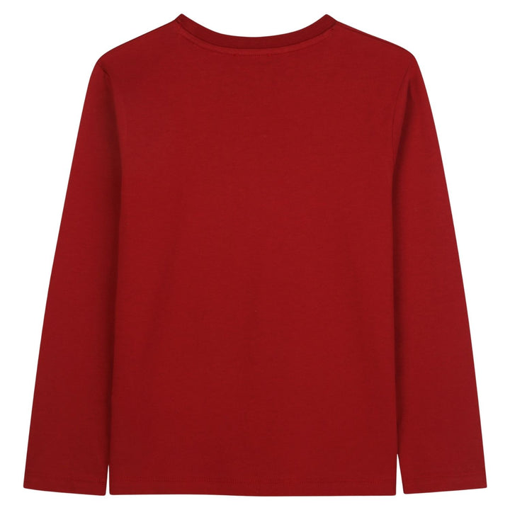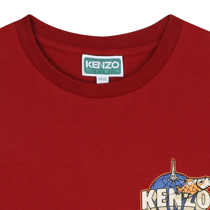 A red T-shirt for boys by KENZO KIDS, made in soft organic cotton jersey. Casual and comfortable, it has a vintage, cosmic-themed logo motif on the front, combining playful elements with iconic branding.