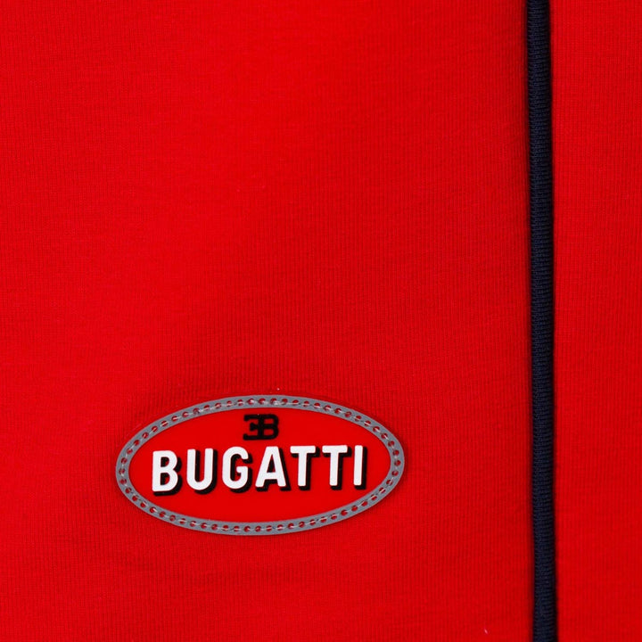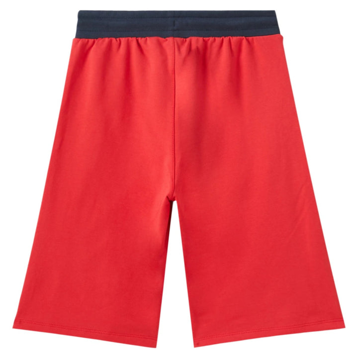 Red shorts for boys by Bugatti Junior. Made from soft cotton, they feature the brands logo rubber badge in red on one leg. They have front pockets and white piping. Finished with an elasticated waistband and drawstring for comfortable fit.