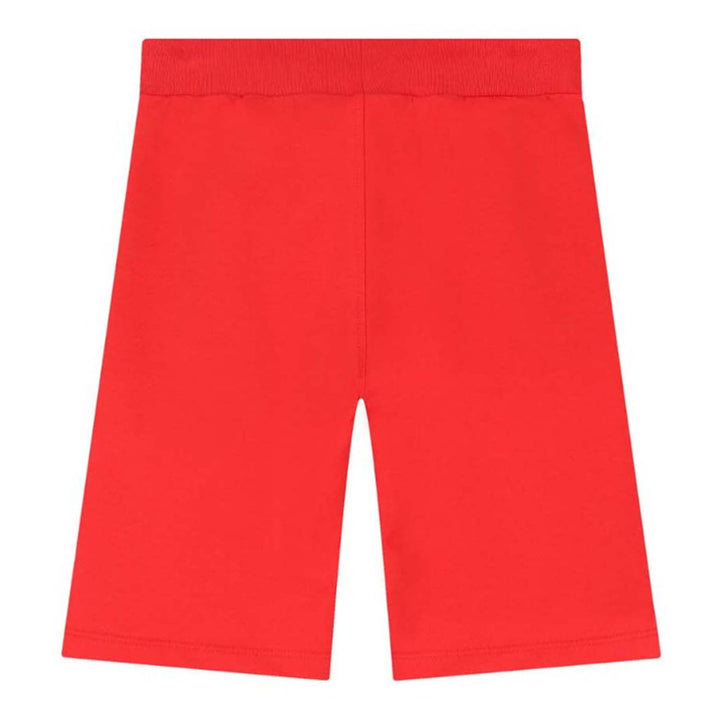 Red shorts by Bugatti Junior. Made from soft cotton jersey, it features black and white trim with the brands logo print in black. Has side pocket and finished with an elasticated waistband and white drawstring for comfortable fit.