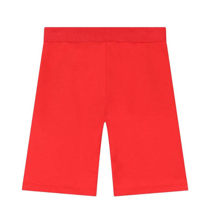 Red shorts by Bugatti Junior. Made from soft cotton jersey, it features black and white trim with the brands logo print in black. Has side pocket and finished with an elasticated waistband and white drawstring for comfortable fit.
