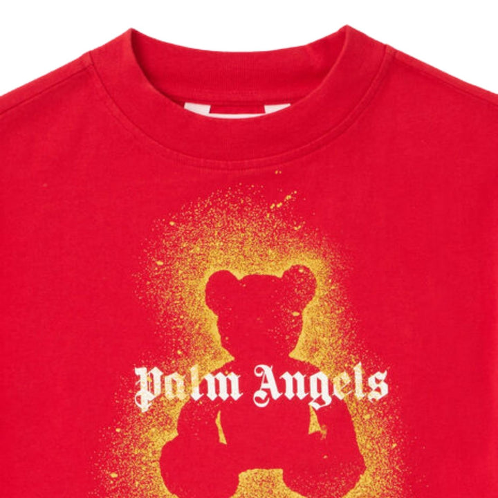 This bold red Palm Angels T-shirt features the brands signature spray-painted teddy bear graphic paired with a contrasting logo print on the front.